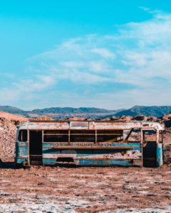 O jeito é se jogar. E depois disso é inevitável não sorrir. Você flutua e continua assim por todo o tempo. Ao sair, registre-se cheio de sal e corra para a ducha. De banhos tomados é hora de seguir para um ônibus antigo abandonado no meio do deserto, o “bus in to the wild”. Num cenário que parece de filme almoçamos e deleitamos a tarde com fotos e um mundo só nosso. É, com certeza, uma das paisagens inesquecíveis do Atacama.
