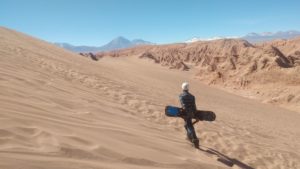 De San Pedro até o Valle de la Muerte são cerca de 13 quilômetros. O caminho de carro é rápido e adentramos por formações rochosas que nos fazem sentir em Marte. Chegamos a uma duna que forma um paredão. É por ela que vamos descer. Recebemos os equipamentos e subimos. De cima, vemos os vulcões Licancabur e Juriques e a Cordilheira dos Andes. Recebemos as instruções de agachar na prancha, equilibrar o corpo e colocar a mão na areia para ajudar na descida. Sentar na areia é o freio de emergência.